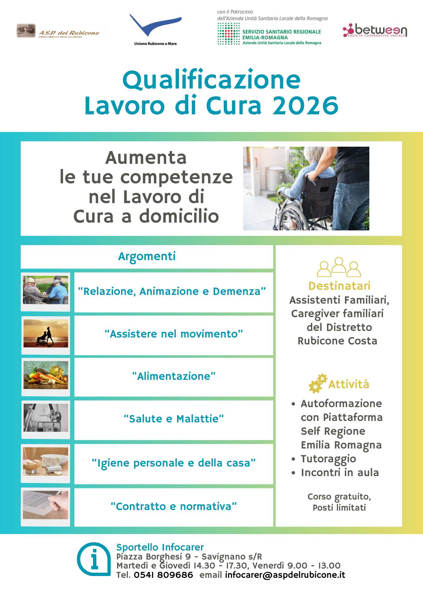 Iscrizioni aperte al percorso di Qualificazione del Lavoro di Cura 2026 rivolto ad assistenti familiari e familiari/caregiver del Distretto Rubicone per consolidare capacità, competenze e garantire standard prestazionali di cura più elevati nell’assistere persone non autosufficienti.